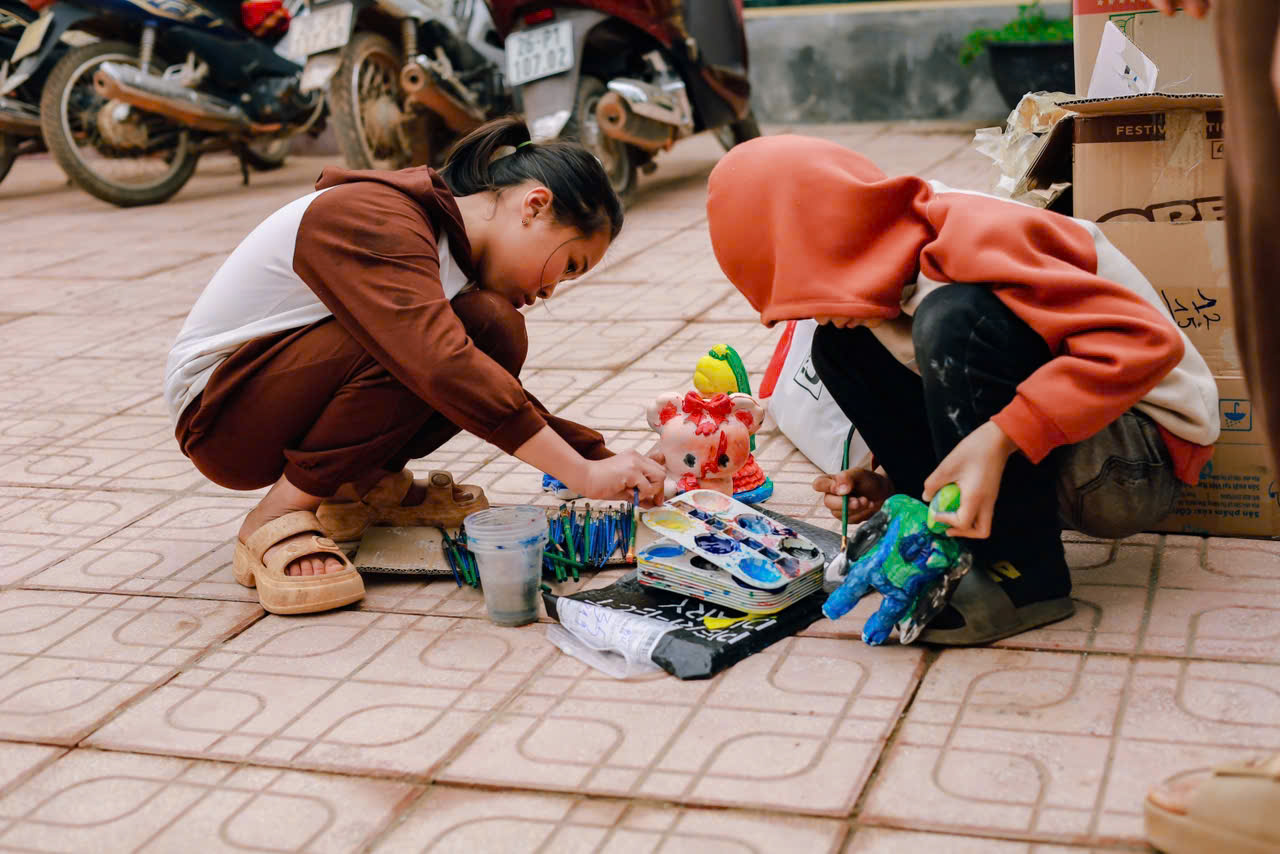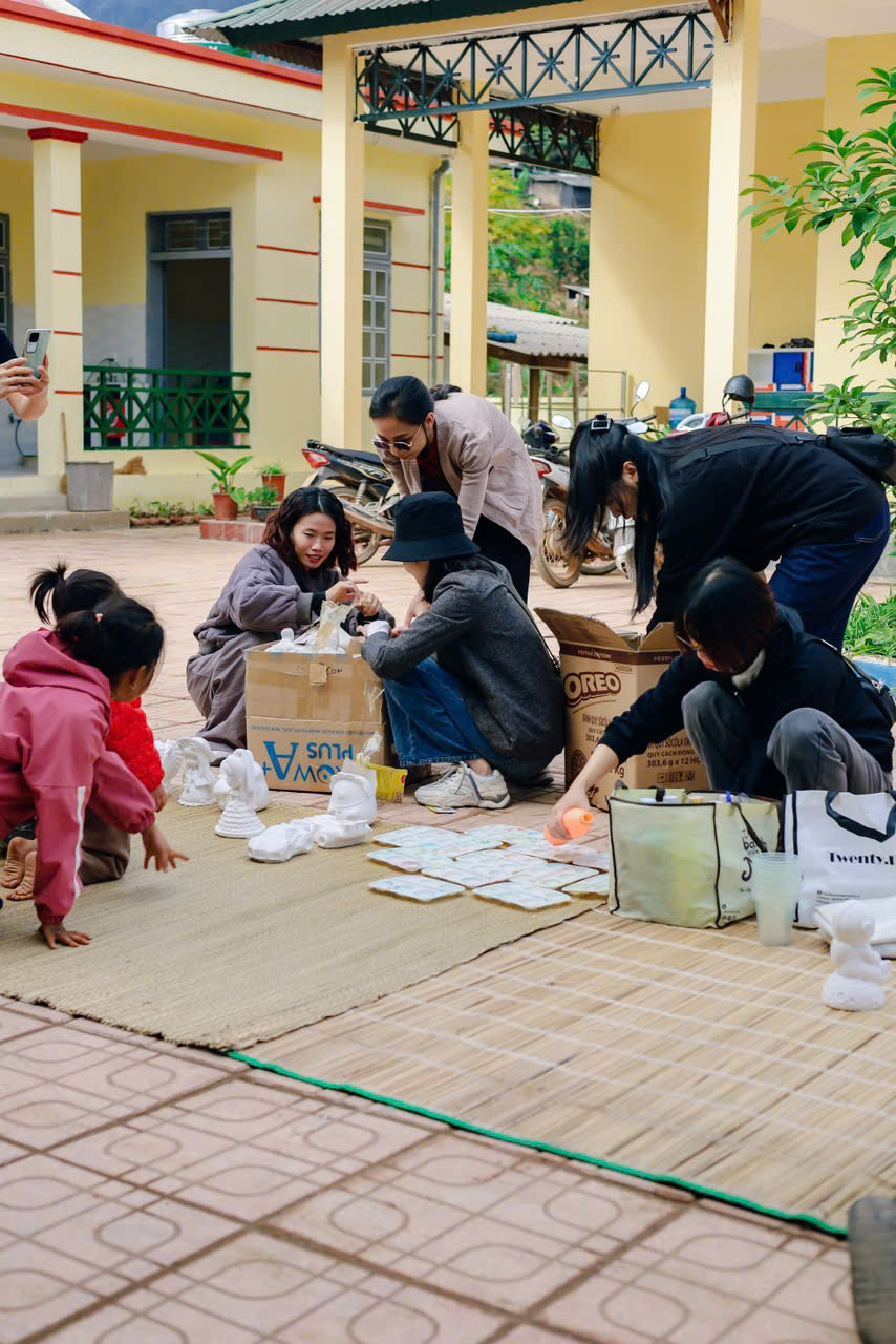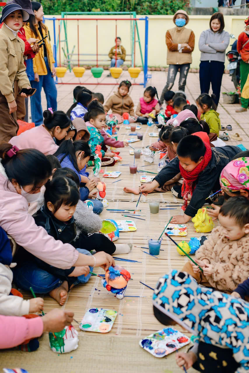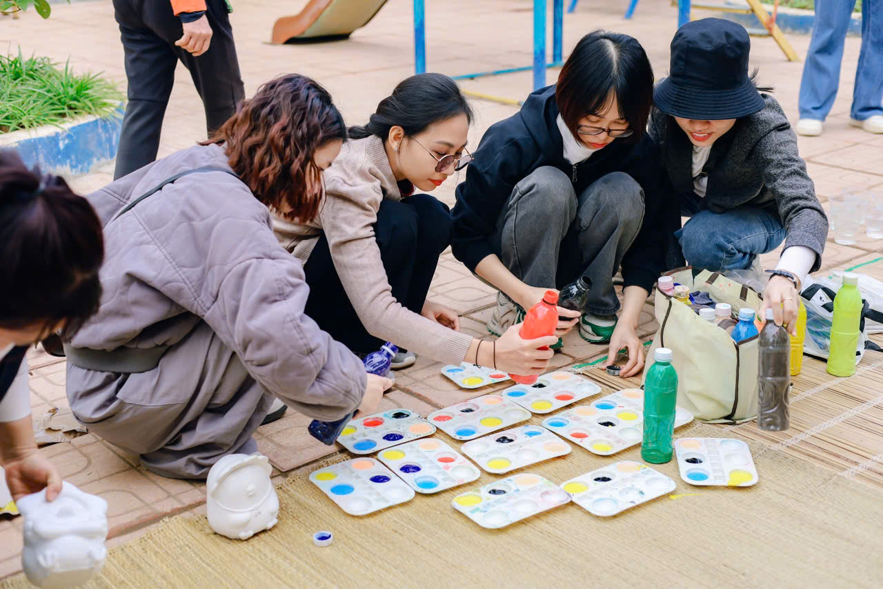 Chúng tớ đã mang thật nhiều tượng trắng lên cho các em – nào là con voi, chú cá, bông hoa hay ngôi nhà nhỏ. Kèm theo đó là những chai màu, khay mực, và cọ vẽ. Khi màu được đổ ra khay, ánh mắt các bạn nhỏ sáng bừng lên, tay cầm cọ còn hơi lóng ngóng nhưng đầy háo hức.