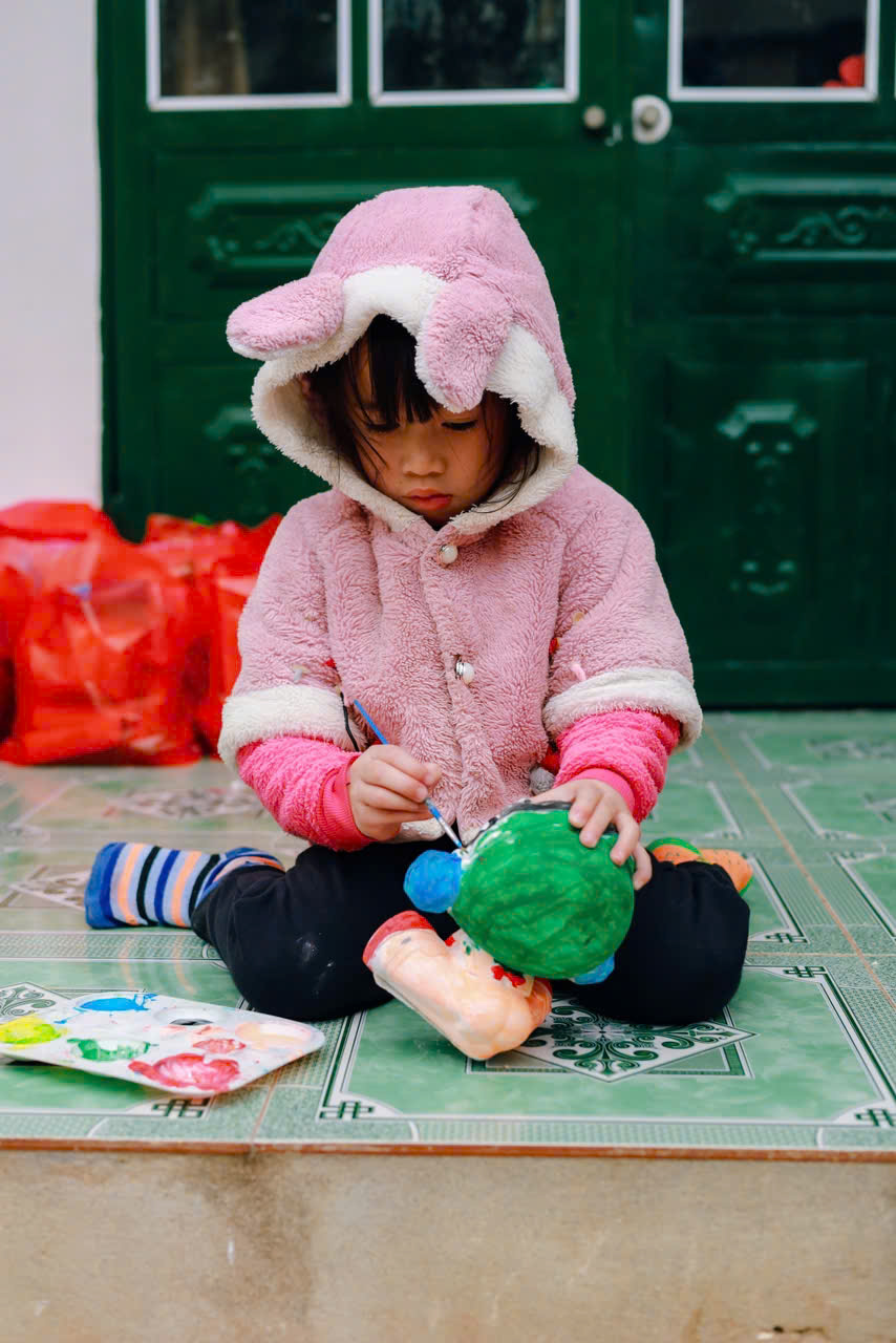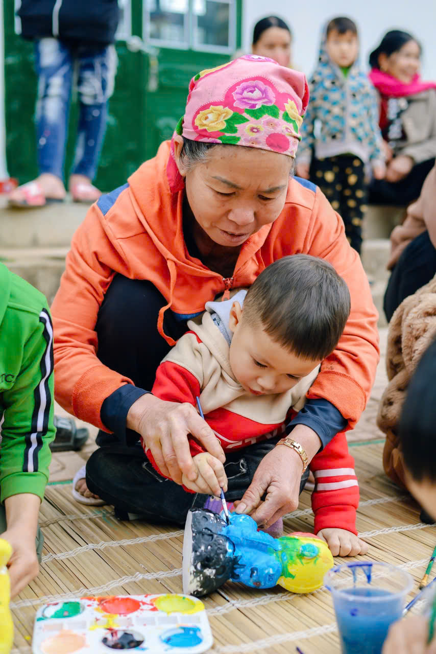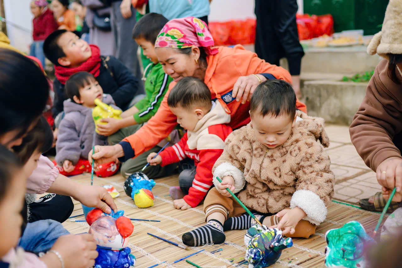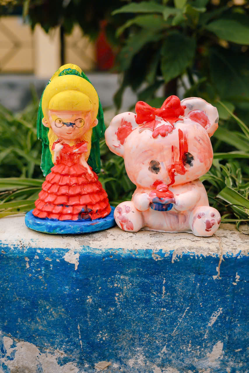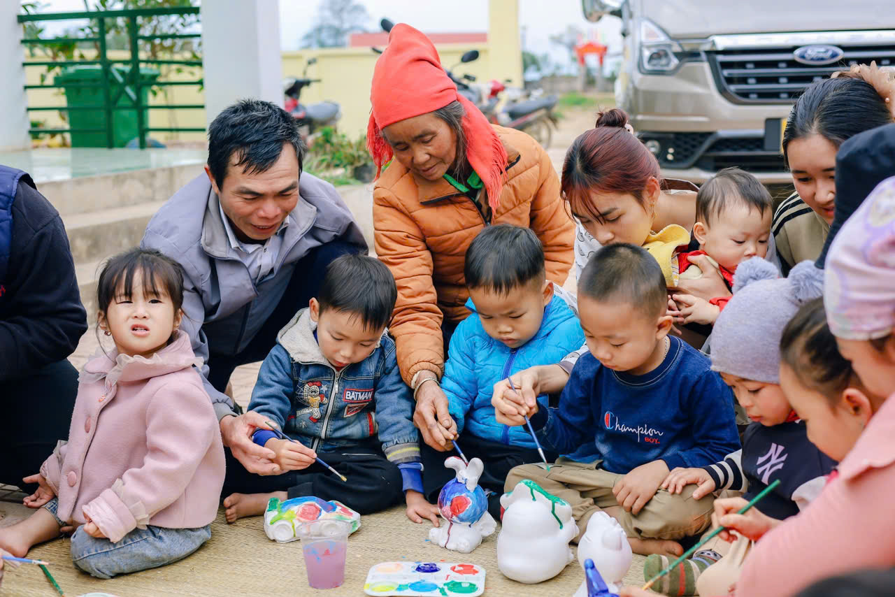 Chúng tớ đã mang thật nhiều tượng trắng lên cho các em – nào là con voi, chú cá, bông hoa hay ngôi nhà nhỏ. Kèm theo đó là những chai màu, khay mực, và cọ vẽ. Khi màu được đổ ra khay, ánh mắt các bạn nhỏ sáng bừng lên, tay cầm cọ còn hơi lóng ngóng nhưng đầy háo hức.